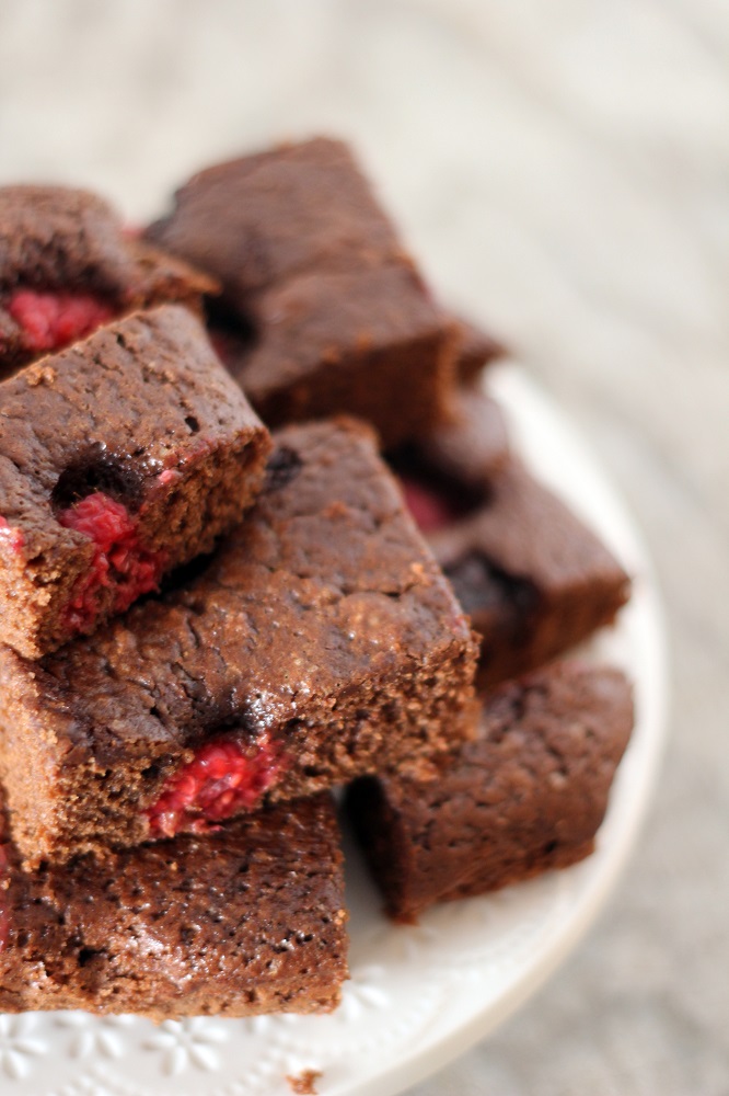 Pré-aquecemos o forno a 170ºC. Colocamos o chocolate e a manteiga numa taça resistente ao calor sobre um tacho com água quase a ferver. Atenção que a base da taça não deve tocar na água. Deixamos ficar até que o chocolate esteja derretido e macio. Retiramos do calor e adicionamos o açúcar. Envolvemos, até que este fique bem incorporado. Adicionamos a farinha e mexemos até que os ingredientes fiquem bem ligados. Acrescentamos os ovos e misturamos até obtermos uma massa espessa e macia. Por fim, juntamos as framboesas, previamente lavadas, à massa. Com a ajuda de uma colher, deitamos a mistura no tabuleiro, previamente preparado, e levamos ao forno durante cerca de 30 - 35 minutos, ou até ficar com uma aparência escamosa por cima mas macia no centro. É preciso algum cuidado para que os brownies não cozam excessivamente. Deixamos arrefecer. completamente antes de servir ou provar.